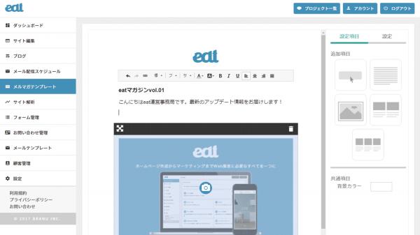 ブラニュー株式会社(本社:東京都港区 / 代表:名富 達哉 以下 ブラニュー)が開発・提供する、ホームページ作成からマーケティングまでWeb集客に必要なすべてを一つにしたマーケティングツール「eat(https://start.eat.auto)」が2018年1月25日に大型アップデートを実施。メールマガジン作成/一括配信機能の追加や顧客情報管理機能の改修を中心に、マーケティング機能がより強化されました。