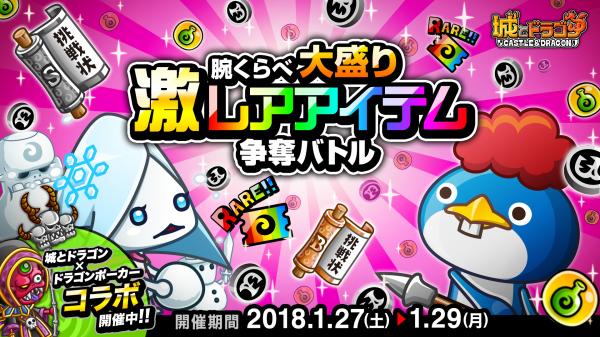 2018年1月27日(土)より、腕くらべモードON の状態でフリー対戦に勝利すると、報酬として1日3回まで豪華レアアイテムがいつもより多くもらえる「腕くらべ大盛り激レアアイテム争奪バトル」を開催いたします。腕くらべモードON でのバトルに勝利して、レアアイテムを手に入れましょう!