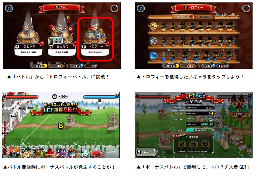 各キャラのトロフィーは、「トロP」を一定数貯めると獲得することができます。トロPは「キャラのLvが20以上」「うまP200以上」など、各キャラによって異なる条件を満たした状態でバトルを行なうと獲得できます。また、バトルを開始すると「ボーナスバトル」が発生することがあり、バトルの勝敗に関係なく、獲得トロPが2・3・5・10倍のうちいずれかの倍率で増加します。ボーナスバトルが発生したら、勝利してトロPの大量獲得を目指しましょう!