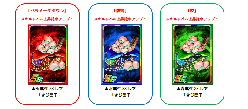 「鬼哭P」を使い素材ガチャを回すと、限定の強化素材「きび団子」を手に入れることができます。限定強化素材「きび団子」は一部のモンスターに使うと強化値2倍の効果があるほか、パラメータダウンスキル・防御スキル・咬スキルのスキルレベル上昇確率もアップします。