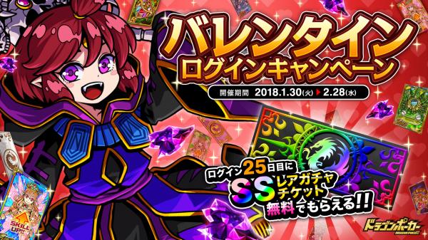 期間中、ログインすると、最大で「竜石」が30個もらえる「バレンタインログインキャンペーン」を開催いたします。5日ログインごとに「SSレアガチャチケット」や「女神スキルフェアリー」など豪華アイテムをプレゼント!毎日ログインして、『ドラゴンポーカー』からのバレンタインプレゼントを受け取りましょう!