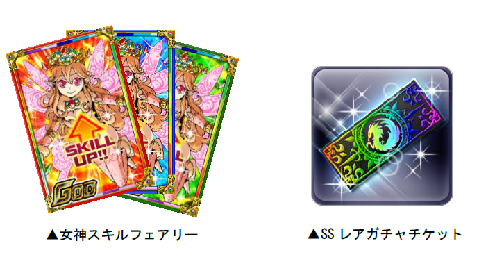 SSレアガチャチケット1枚、竜石30個、女神スキルフェアリー各属性1枚ずつ、天輝ジェムマローン各属性1枚ずつ、Sレア進化指輪各属性2枚ずつ、Sレアガチャチケット3枚、レアガチャチケット5枚、ブーストチケット各種5枚ずつ
