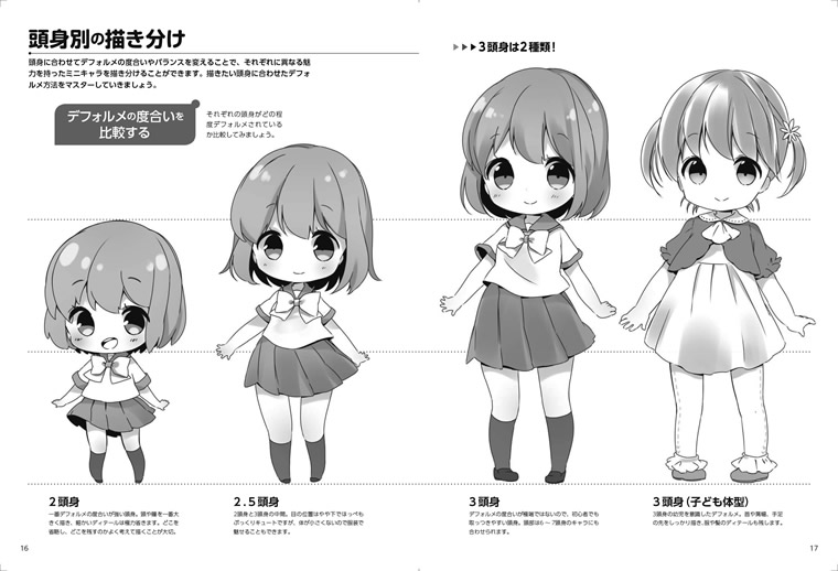 本書では、ミニキャラクターの描き方を「2.5頭身」「2頭身」「3頭身」の3種類に分けて解説。バランスのよい2.5頭身キャラ、ちまっとしたかわいさの2頭身キャラ、元気いっぱいに動く3頭身キャラまで……。それぞれの頭身に合った描き方手順や、上手なデフォルメのコツを紹介していきます。