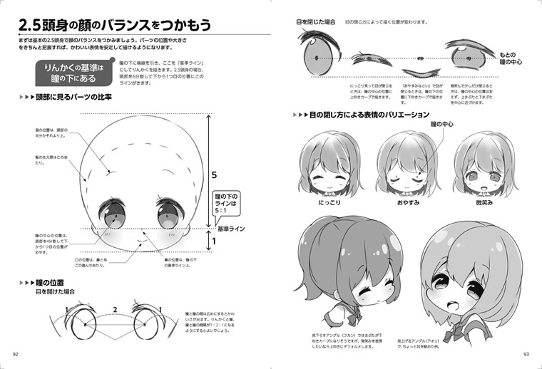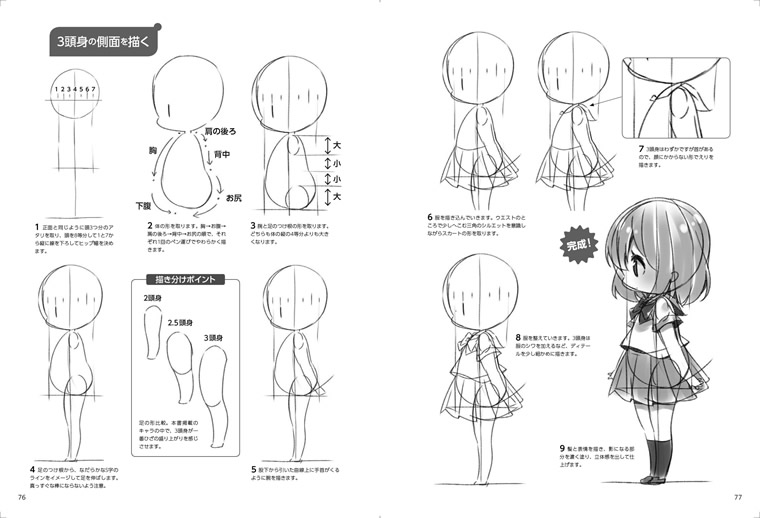 頭身ごとの描き分けのみならず、キャラの性格や気持ちに合わせた描き分けの方法も解説。ミニキャラのうれしい気持ちを表現するにはどんな表情とポーズを描けばいいか。怒っているときのポーズをかわいく描くにはどうしたらいいか、などなど……。手足の短いミニキャラにうまくポーズをつけて、個性豊かに描き分けるテクニックも満載です。