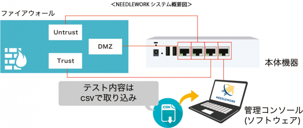 『NEEDLEWORK』は、ファイアウォールの通信テストを自動で実施することができる小型のアプライアンスです。
