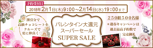 「2018年ベストワンクルーズバレンタイン大還元SUPER SALE」は、カップル、ご夫婦、ハネムーナーを対象にクルーズ100コース以上を最大10%割引などバレンタイン大還元にて販売いたします。