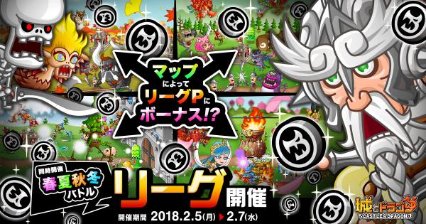 2月5日(月)より全国のユーザーたちを相手にリアルタイムで戦い、ランキングを競い合う「リーグ」を開催いたします。今回のリーグは、バトルフィールドがランダムで変化する「春夏秋冬バトル」が同時開催されます。バトルに勝利して、ランキング報酬のドラゴンメダル大量獲得を目指しましょう!