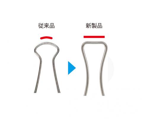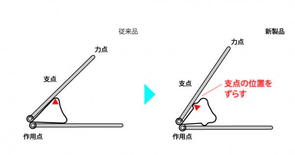 本体部分に突起をつくり支点の位置をずらし、さらにレバーの長さを変更することで、「てこの原理」を利用し軽い力でクリップを開くことができます。当社の従来品に比べ、開く力を最大約50%※削減しています。