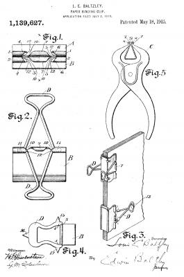 「てこの原理」を利用してレバーで本体を開き、書類を挟む「ダブルクリップ」。このシンプルな機構は、アメリカ人のルイス・エドウイン・バルツレーさんが発明。1915年に米国で特許登録され(右図参照)、その後も形状がほぼ変わることなく、時代を超えて広く使用されてきました。英国の著名な書籍「ファイドン・デザイン・クラシック」(2006年)にも、優れた国際デザインの工業製品999のひとつとして掲載されています。
