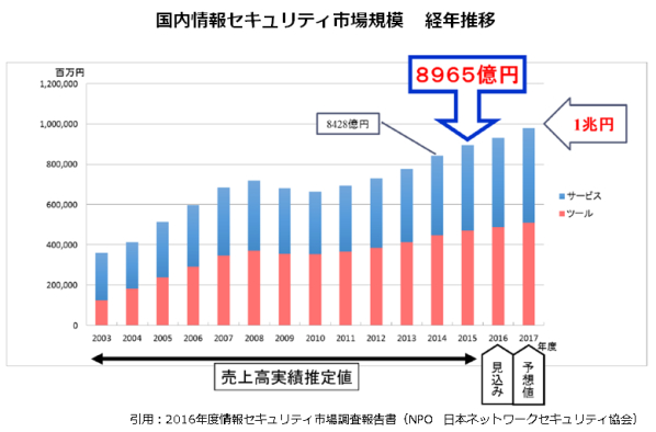 あらゆる情報がデジタルデータとしてインターネット上を流れる今日、その漏えいや改ざん、破壊・消失といった脅威は一層の高まりを見せています。特に近年では既存のセキュリティ対策では防ぎきれないランサムウェアなども拡大傾向にあり、2016年には個人情報漏えいだけで想定被害総額約2,800億円、1件当り平均想定被害額は約6億3千万円(※1)に上っています。また、リスク対策強化の必要性から国内関連市場規模も拡大基調を続けており、2017年には1兆円規模に達するとも予想されています。(下図参照)