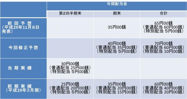 上記の業績予想の通り、平成30年3月期の当社グループ業績が前回予想を上回る見込みとなりましたので、株主の皆さまへの利益還元といたしまして、当期の剰余金の期末配当につきましては、期初予想の1株当たり35円に特別配当金5円を加えまして1株当たり40円に増額修正いたします。