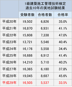 平成29年度の1級建築施工管理技術検定 実地試験受験者数は16,505名(平成28年度:19,045名、前年比2,540名減)となり、合格者数は5,537名(同28年度:8,687名、前年比3,150名減)、合格率33.5%(同28年度:45.6%、前年比12.1ポイント減)となり、過去10年で最も低い合格率となりました。平成29年度は、学科試験の合格率も前年比約10ポイント減(平成28年度合格率49.4%、平成29年度合格率39.7%)となり、学科試験・実地試験ともに難化したといえます。