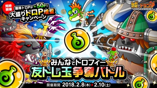 2月8日(木)より、みんなでトロフィーバトルに勝利すると、友トレ玉満タン回復が1個もらえる「みんなでトロフィー友トレ玉争奪バトル」が開催されます。また、獲得トロPが通常より50P増量する「大盛りトロP増量キャンペーン」も同時開催されます。みんなで協力して、友トレ玉を手に入れましょう!