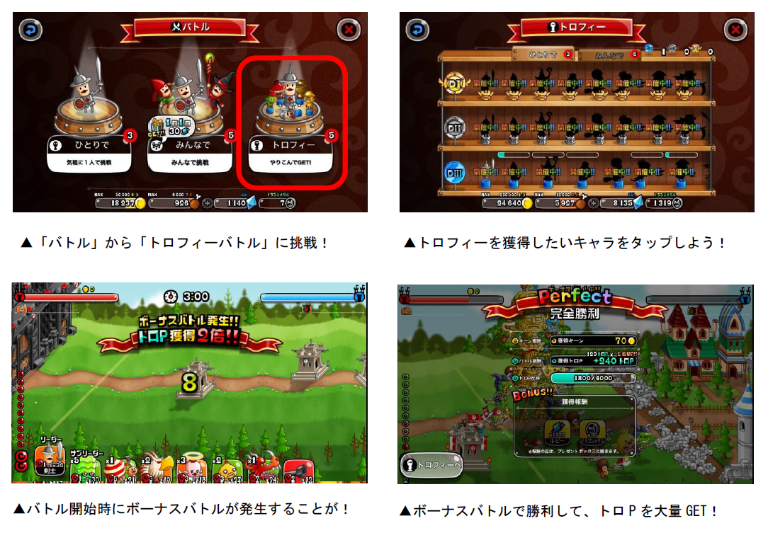 各キャラのトロフィーは、「トロP」を一定数貯めると獲得することができます。トロPは「キャラのLvが20以上」「うまP200以上」など、各キャラによって異なる条件を満たした状態でバトルを行なうと獲得できます。また、バトルを開始すると「ボーナスバトル」が発生することがあり、バトルの勝敗に関係なく、獲得トロPが2・3・5・10倍のうちいずれかの倍率で増加します。ボーナスバトルが発生したら、勝利してトロPの大量獲得を目指しましょう!