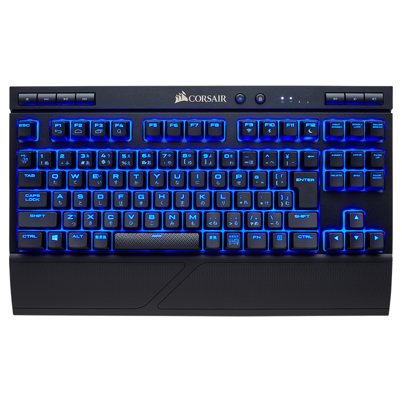 K63 Wirelessは、Cherry MX Redを採用した10キーレスワイヤレスゲーミングキーボードです。1msの低遅延と128bit暗号化で接続する2.4GHz高速ワイヤレスと、高速転送とセキュリティを高めたBluetooth(R) 4.2 + LEに対応した、2つの無線通信と付属するUSBケーブルによる有線接続が可能です。先進のドライバソフトCorsair Utility Engine(CUE)によって、各キーに備えられたブルーLEDバックライトの独立設定、イルミネーション設定をはじめ、高度なマクロ処理、豊富なキーバインド制御を実現します。100%アンチゴースト、Nキーロールオーバー対応、プレイ中の誤操作を防ぐWindowsロック機能、手元で操作できる便利なマルチメディアキーを備えています。