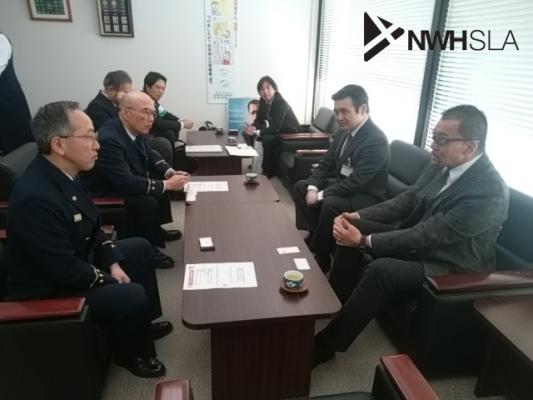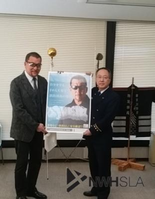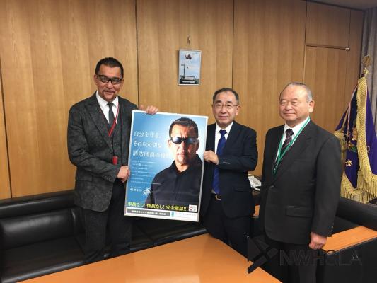 消防の関係各位を訪問した蝶野さんは、出来上がったばかりのポスターを持参。今回のポスターは、消防70周年にあたる今年、全国2万3千か所に及ぶ消防団の詰め所・屯所などに貼って、団員に安全管理の重要性を啓発するためのポスターになります。