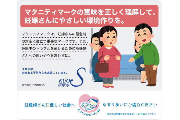 弊社主力商品である『炭酸水KUOS-クオス』と厚生労働省が『健やか親子21』の取り組みの一つとして作られた『マタニティマーク』とのタイアップを行い未来のお母さんと赤ちゃんに優しい環境づくりを応援しています。