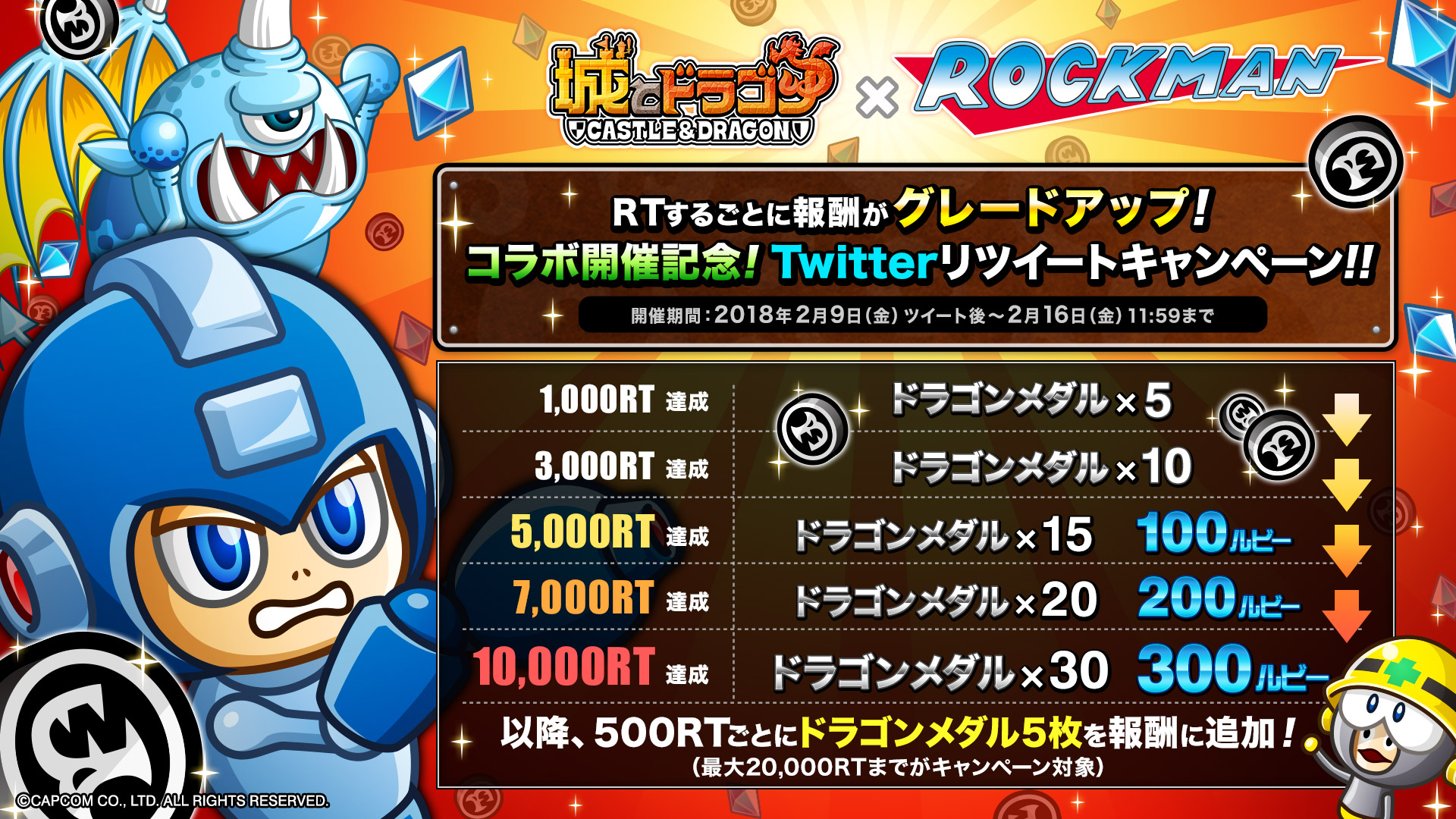 『ロックマン』とのコラボイベント開催決定を記念して、「Twitterリツイートキャンペーン」を開催いたします。『城とドラゴン』公式Twitterアカウント(@shirotodoragon)がつぶやいた、キャンペーン対象ツイートの公式リツイート総数に応じて、ゲーム内で使用できるアイテムをユーザー全員にプレゼントいたします。