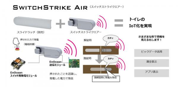 このSWITCHSTRIKE AIRには、トイレの施錠金物として、受け部に無線通信デバイス「EnOcean」が組み込まれており、どんな場所にもドライバー1本で簡単に設置でき、個室トイレの施錠・解錠情報を電池レス・配線レスで無線送信することができます。この情報を利用し、トイレ入り口や専用アプリで満空表示することで、利用者の時間短縮(利用効率の向上)や長時間利用の検知、ビッグデータ化による利用状況の解析や清掃の効率化を実現することができます。これらにより、不特定多数の人が訪れる商業施設や観光施設、イベント会場、これから混雑が予想される大規模なスポーツイベントなどで、トイレの利用効率や利便性向上、施設管理の適正化に貢献します。