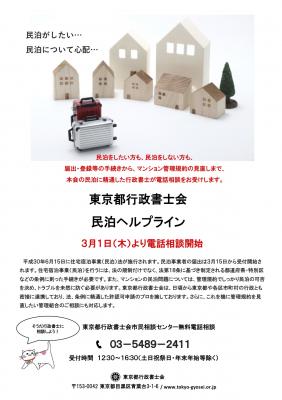 東京都行政書士会では、民泊に関する都民の皆様からのご相談に、所属行政書士が無料で電話相談をお受けする、「民泊ヘルプライン」を3月1日(木)より開始いたします。