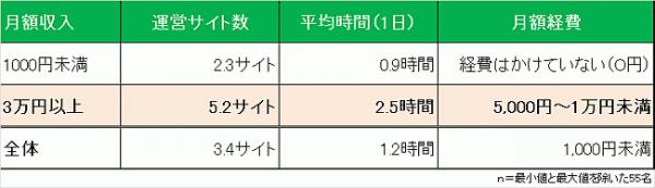 アフィリエイト市場調査2017の回答者を、月のアフィリエイト収入1,000円未満と3万円以上にグループ分けしてみた結果が下記テーブルです。運営しているサイト数、1日あたりアフィリエイトにかけている時間に2倍以上の違いがある事が分かります。