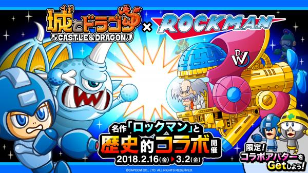 2018年2月16日(金)メンテナンス後より、名作アクションゲーム『ロックマン』とのコラボイベントを開催いたします。コラボ期間中でしか手に入らない限定キャラとして「ロックマン」もEGG ショップに登場!「ロックマン」は研究開発をすることで、「ブルースセット」や「エアーマン風」などさまざまな衣装にお着替えが可能です。さらに、「Dr.ワイリー」が城に攻めてくるコラボ襲来イベントやコラボSP討伐イベント、豪華報酬が毎日もらえるログインキャンペーンなどを同時開催いたします。「ロックマン」の世界が再現された夢のコラボをどうぞお楽しみください!