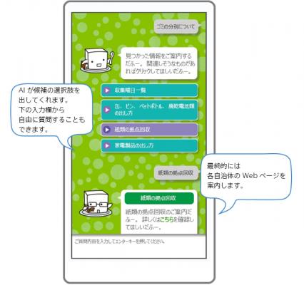 チャットは人工知能技術(AI)を利用した学習済みのものを提供し、子育て、引越し・住所変更の手続き、ごみの出し方、住民票や戸籍、各種書類の請求など住民からの問い合わせ全般に応えることが可能です。機能は Web アプリケーションとして提供され、利用者は PC とスマートフォンから問い合わせを行うことができます。