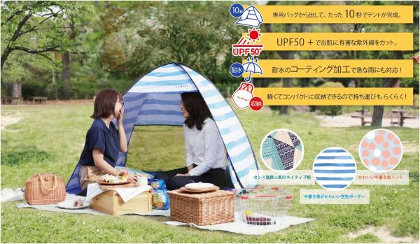 専用バッグから取りだすだけで、あっという間にテントが完成!耐水、UPF50+コーティングが施されているので、どこでも簡単に快適な空間をおつくりいただけます。