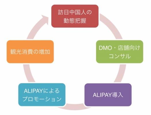 この取り組みは、商品の購入場所や日時、購入商品などの情報が含まれるアリペイの決済情報と、訪日中国人のWi-Fiの利用データ、投稿したSNSの位置情報(※2)を組み合わせて分析し、訪日中国人の観光動態を把握するものです。消費行動と移動情報を掛け合わせることで、集客から消費促進まで一気通貫したプロモーション施策に活用し、アリペイ未導入による機会損失を防ぐとともに、Alipayアプリ内のO2O機能「Discover(口碑/Koubei)」(※3)の活用による来店促進を狙いとしています。