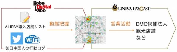 データ分析技術を使ったサービスを展開する株式会社神戸デジタル・ラボ(本社:兵庫県神戸市中央区、代表取締役:永吉一郎、以下KDL)と中国のモバイル決済「アリペイ(支付宝)(※1)」を日本で提供する株式会社ユニヴァ・ペイキャスト(東京都港区、代表取締役:呉 英仁、以下ユニヴァ・ペイキャスト)は、アリペイの決済情報とSNSやWi-Fiの利用データを活用した、訪日中国人の観光動向に関するデータ分析の取り組みを開始いたします。