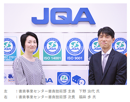 JQAは、企業のISO 9001やISO 14001、ISO/IEC 27001といったマネジメントシステムがISO規格に適合しているかを審査・認証する機関で、国内でISO認証が始まった初期から審査に取り組み、ISO 9001とISO 14001を合わせた認証件数(約1万件)は、国内最多の実績を誇ります。