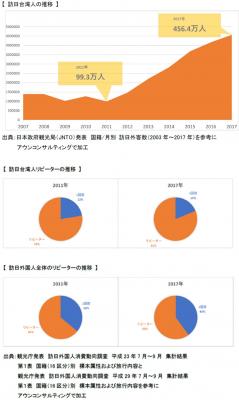 また、近年はアジア圏のリピーターが増加しており、台湾もリピーターが多い国の1つです。下の表にあるように2017年のリピーター数で訪日外国人全体と比較しても20%以上上回っており、台湾単体で見ても、リピーターの割合は少しずつ増加しています。