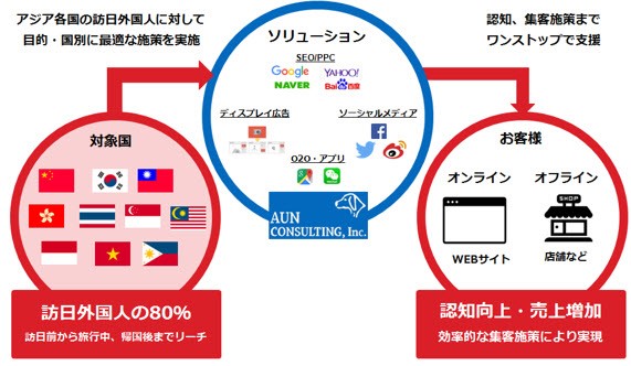 アウンコンサルティングでは、SEO(検索エンジン最適化)、PPC(検索連動型広告)、ソーシャルメディア、スマートフォン広告などのグローバルマーケティングサービスを、日本語だけではなく、外国語も対象に行っています。現在48の国と地域にサービス実績があり、英語、中国語(簡体字、繁体字)、タイ語やその他の外国語にも幅広く対応しています。また、台湾、香港、フィリピン、タイ、ベトナム、シンガポール、韓国の海外7拠点を生かし、アジアの現地情報やグローバルインターネットマーケティングにおけるナレッジを蓄積しております。グローバルマーケティングについて、また、現地情報の収集の際にも是非ご相談ください。