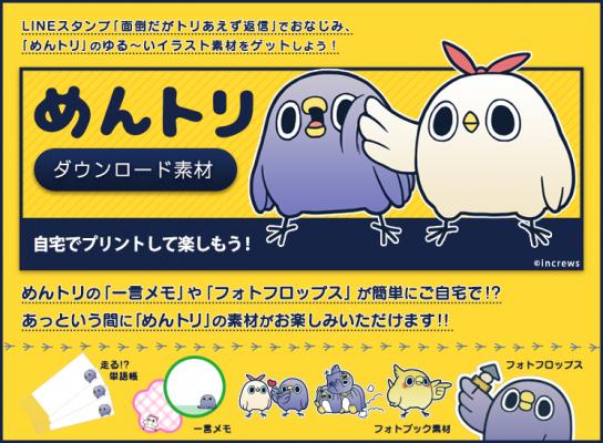 大人気LINEスタンプ「面倒だがトリあえず返信」シリーズでお馴染みの「めんトリ」達のプリントコンテンツの配信開始!ご自宅で簡単にプリントアウトし何度でもお使い頂けます。