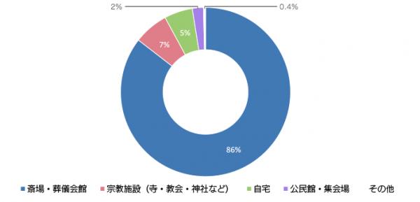 葬儀・お葬式を行った会場については、「斎場・葬儀会館」が86%と最も多くなりました。次いで「宗教施設(寺・教会・神社)」7%、「自宅」5%と続きます。葬儀専門の会場を選ぶ割合が非常に高い結果となっています。
