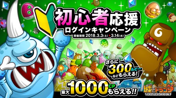 3月3日(土)より、期間中にログインするだけでルビーやCPなどのアイテムがもらえる「初心者応援ログインキャンペーン」を開催いたします。また、城Lv20以下のプレイヤーと一緒にバトルを行なうと特典がある「ルーキーさまさまキャンペーン」を同時開催いたします。その他にもイベントやキャンペーンを多数開催いたしますので、お友だちを誘って、一緒にバトルを楽しみましょう!