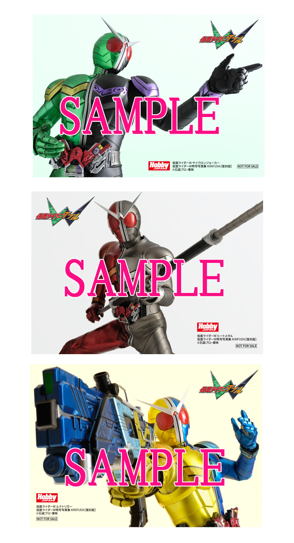該当する書店様にて「仮面ライダーW 特写写真集 KIRIFUDA[復刻版]」をご購入頂いた方へ特製ブロマイド3種類(1セット)をプレゼントさせていただきます。