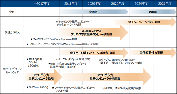2020年以降には、IBM、Googleなどによる「量子ゲート型コンピュータ」のクラウドサービスが始まる見込みです。両社が提供する予定の50量子ビットの量子コンピュータは、理論上はペタフロップス※4級のスーパーコンピュータの演算能力を持ち、従来のコンピュータを凌駕する「量子超越性」※5を実現する可能性があります。