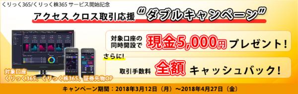この度当社では、2018年3月9日(金)より、「くりっく365/くりっく株365」の口座開設の受付を開始いたしましたのでお知らせいたします。また、オンライントレード(アクセス クロス)でのサービス開始を記念して、「アクセス クロス取引応援ダブルキャンペーン」を実施いたしますので、この機会に多くのお客様に「くりっく365/くりっく株365」をご利用いただきたいと考えております。
