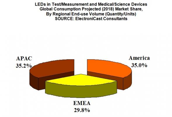 This market forecast report, which is available immediately, is part of a consultant service from ElectroniCast Consultants to our clients. This 2017-2027 market estimate and forecast is presented for our extensive study of the worldwide use of packaged Light Emitting Diodes (LEDs) in Test/ Measurement, Medical and other Science Devices.