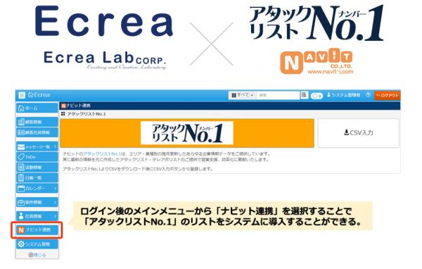 データ・リストの販売、調査代行の株式会社ナビット(東京都千代田区、代表取締役 福井泰代、以下、ナビット)と、コーディネート型SFAを提供する株式会社エクレアラボ(東京都新宿区、代表取締役 高山恵一)は、通常のアタックリストに企業規模、売上規模、資本金規模などの属性情報が付与された「アタックリストNo.1」とコーディネート型営業支援システム(SFA)「Ecrea」の連携が完了し、本日から提供開始することを発表いたします。