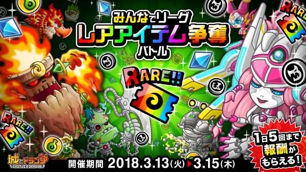 3月13日(火)より、全国のユーザーたちを相手にリアルタイムで戦い、ランキングを競いあう「リーグ」が開催!また、期間中、タッグまたはトリオのリーグで勝利すると、報酬として1日5回までルビーやレアアバター券などの豪華報酬がもらえる「みんなでリーグ レアアイテム争奪バトル」を開催いたします。みんなで協力してリーグで勝利し、レアアイテムを手に入れましょう!