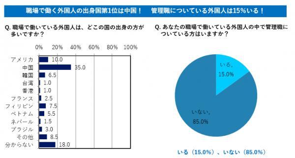 まずはじめに、職場の同僚外国人の出身国籍について調査したところ、上位から、中国(35%)、アメリカ(10%)、フィリピン(7.5%)、韓国(6.5%)、ベトナム(5.5%)という結果になりました。また、管理職についている外国人の割合は、全体の15%ということもわかりました。