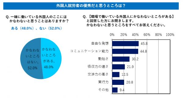 およそ半数の人が、一緒に働いている外国人にかなわないところがあると回答。さらに、特に優れていると感じる点については、上位から、自由な発想(45.8%)、コミュニケーション能力(44.8%)、勤勉さ(30.2%)、吸収力の速さ(21.9%)、実行力(20.8%)、交渉力の高さ(12.5%)という順位となりました。勤勉さでは、世界でも評価の高い日本人でも外国人にかなわないと感じている人が多くいることが分かりました。