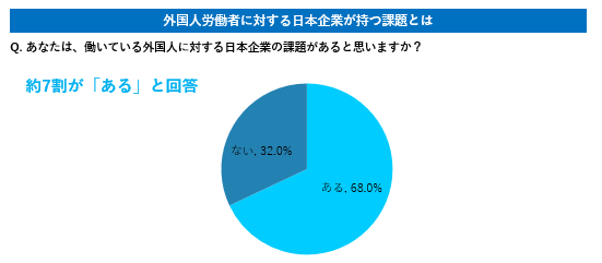 ・日本企業の外国人労働者への対応について、約7割が「課題がある」と感じている。