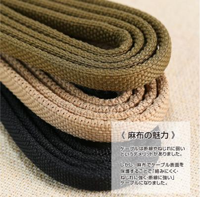 麻布を丁寧に織り込んで仕上げました。表面を保護することで絡みづらく丈夫になり、使うほどよく馴染むケーブルになります。
