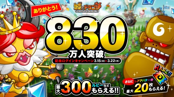 この度、『城とドラゴン』の登録ユーザー数が830万人を突破いたしました。日頃よりお楽しみいただいているユーザーの皆様へ心より御礼申し上げます。これを記念して、3月15日(木)より、ログインするだけで最大300ルビーやレアアバター券などが手に入る「830万人突破記念ログインキャンペーン」を開催いたします。