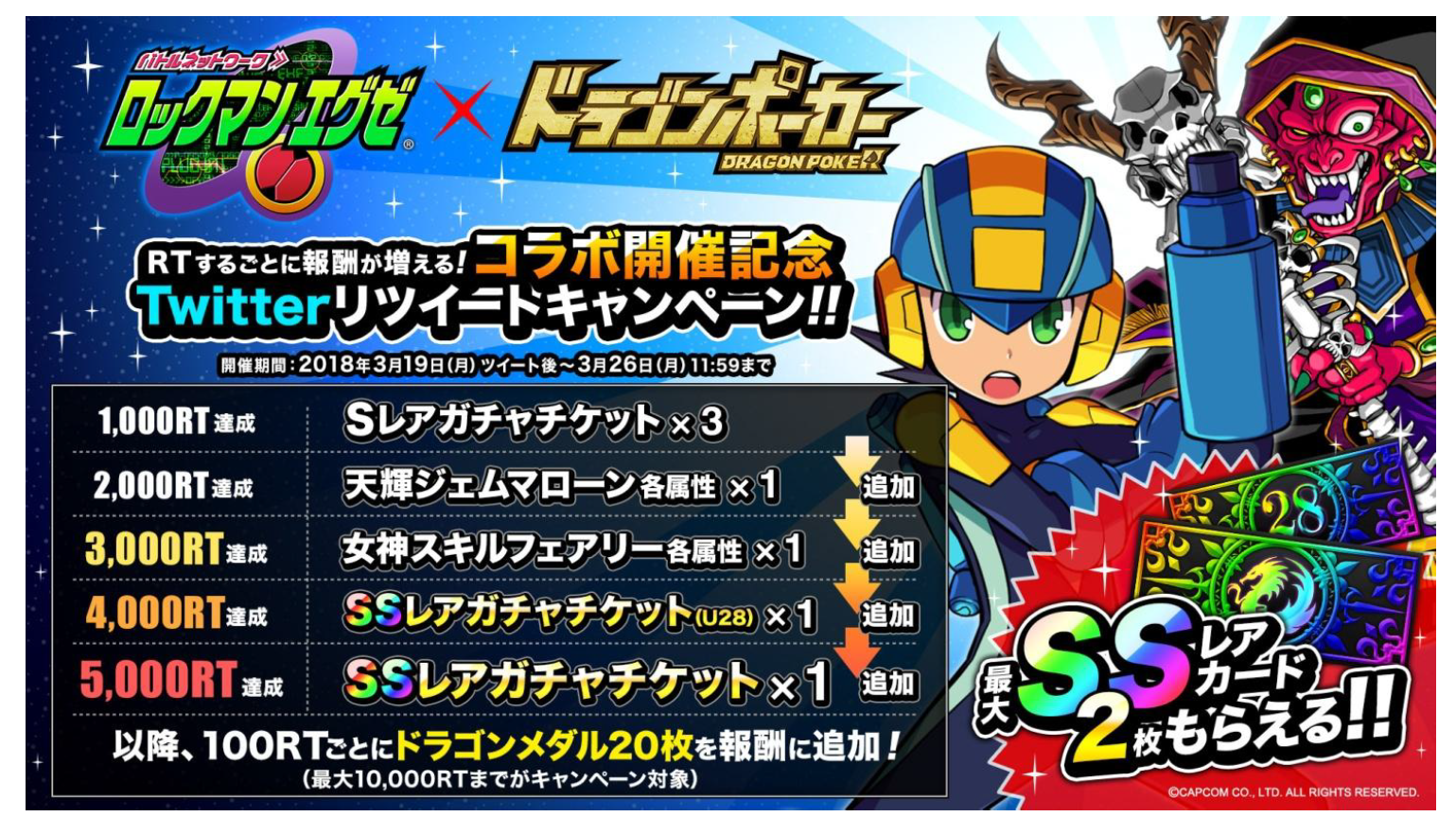 『ロックマン エグゼ』とのコラボイベント開催決定を記念して、「Twitterリツイートキャンペーン」を開催いたします。『ドラゴンポーカー』公式Twitterアカウント(@DragonPoker_aso)がつぶやいた、キャンペーン対象ツイートの公式リツイート数が一定数を達成すると、ゲーム内で使用できるアイテムをユーザー全員にプレゼントいたします。