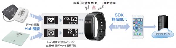 ※A&D製のBluetooth内蔵血圧計、Bluetooth内蔵体重計と接続して、リストバンドに