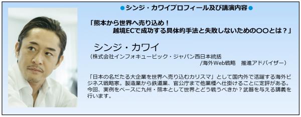 「熊本から世界へ売り込め!越境ECで成功する具体的手法と失敗しないための〇〇とは?」をテーマに、弊社西日本統括/海外Web戦略推進アドバイザー シンジ・カワイが登壇し、海外ビジネスをはじめたい、海外ビジネスに興味を持ち始めたとういう経営者の皆様に、実例をベースに講義を行います。